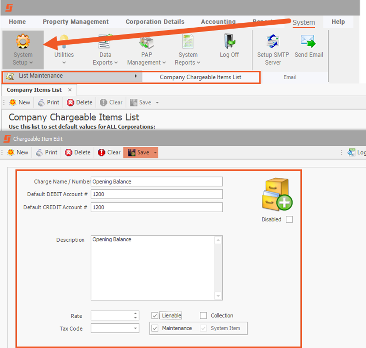- In your Company Chargeable Items, create a new charge type called “Opening Balances” Set the Debit and Credit account fields to your Accounts Receivable account #.
